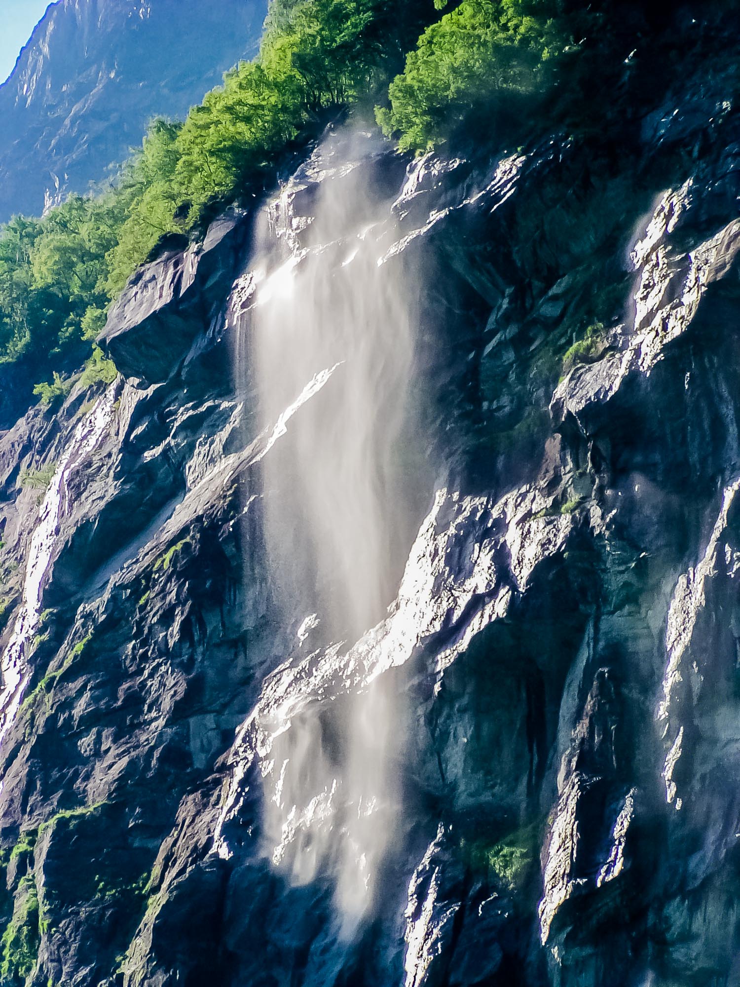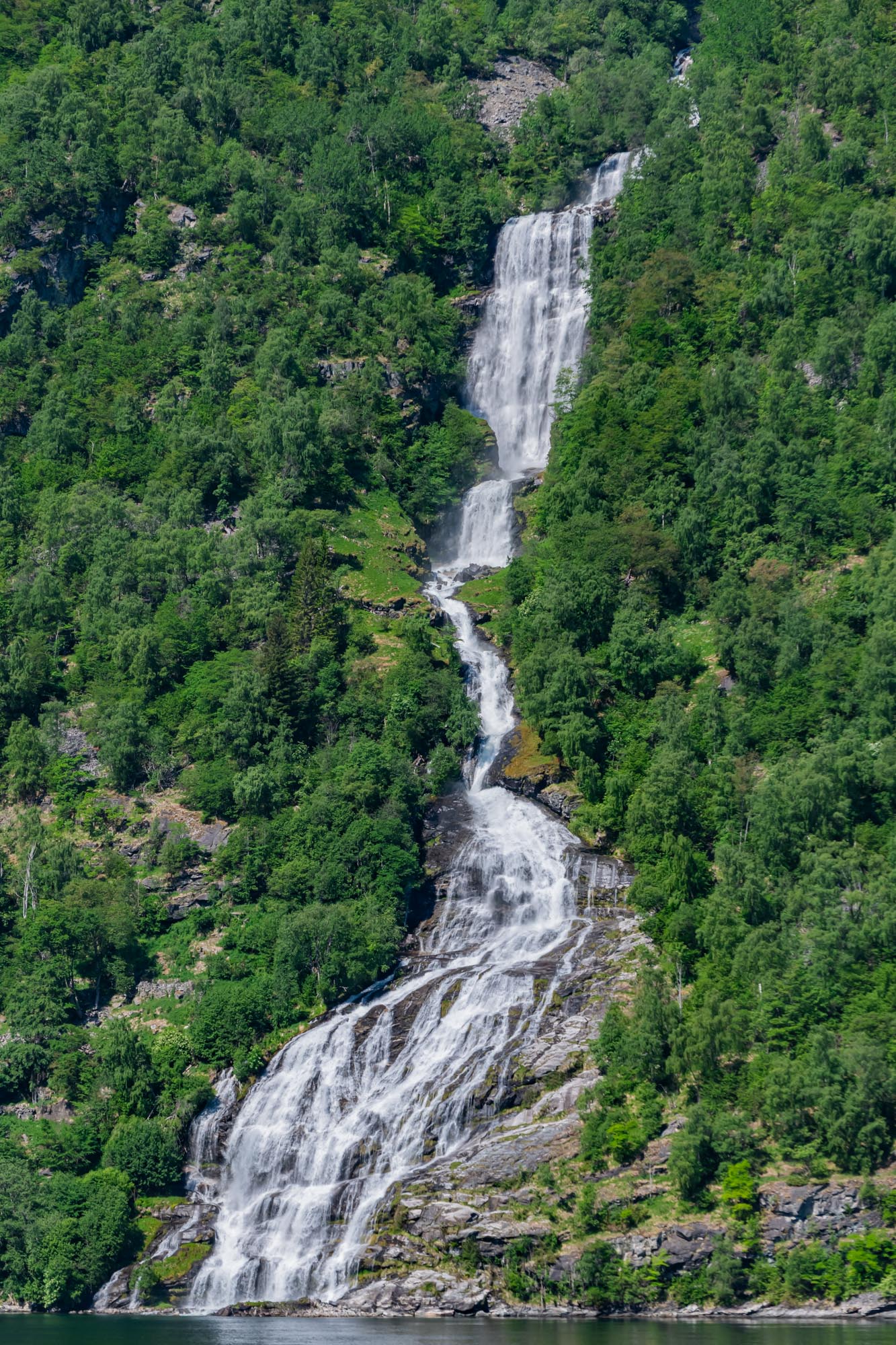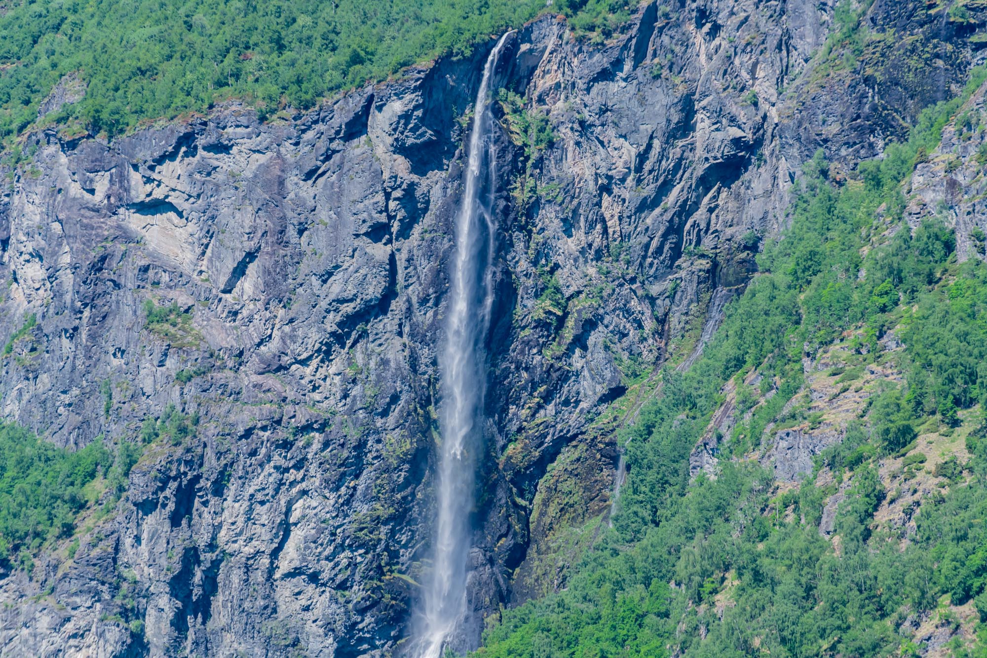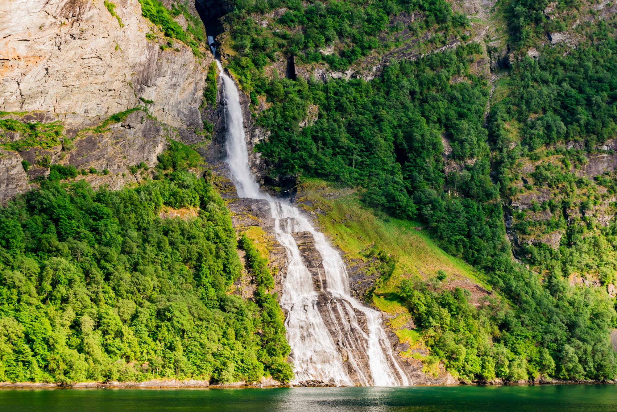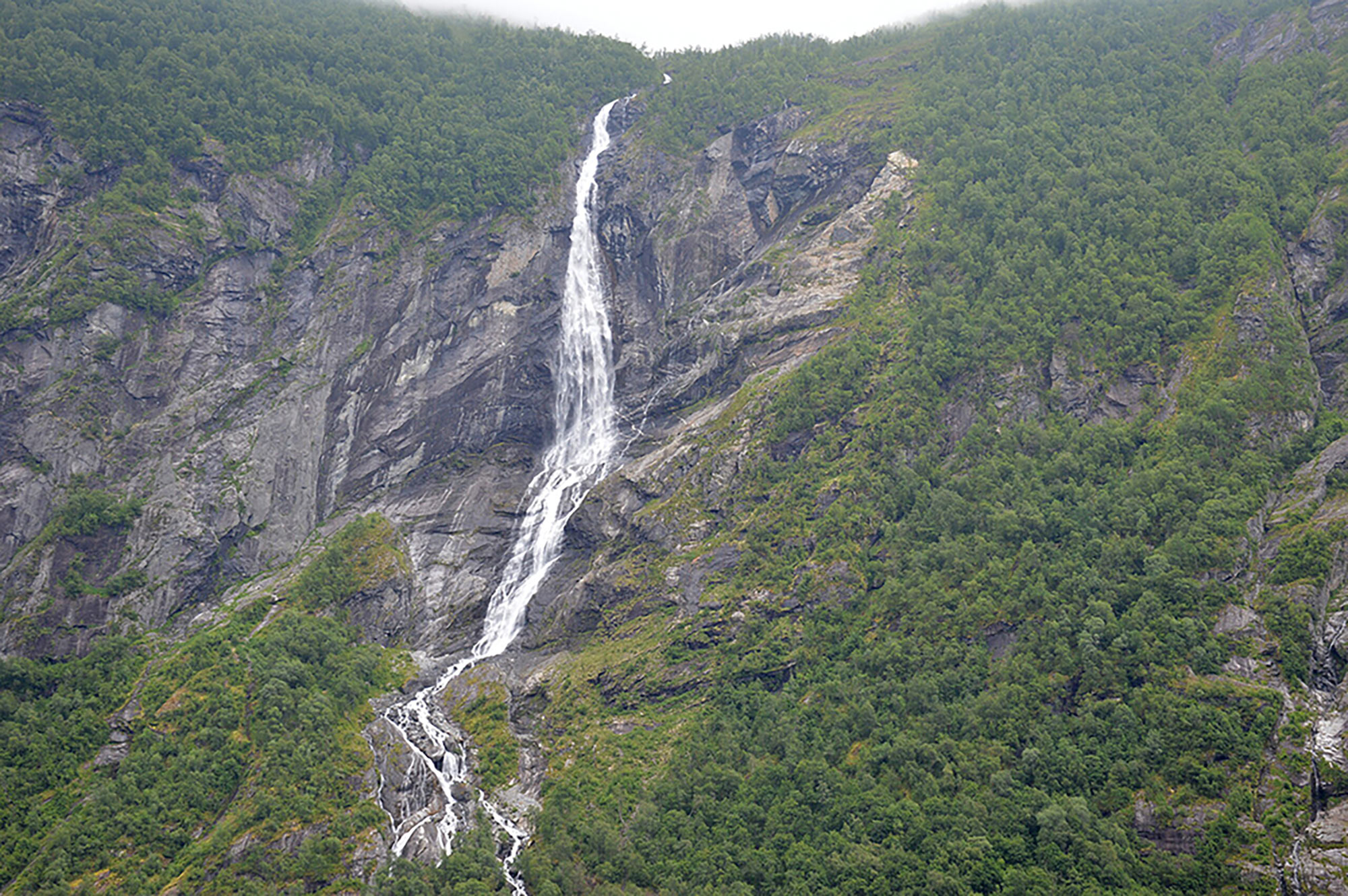 Ein weiteres auffälliges Merkmal sind die Wasserfälle, die an vielen Stellen von den Bergflanken in den Fjord stürzen. Sie sind ein direktes Ergebnis der Eiszeitgeschichte. Als die Gletscher das Haupttal sehr tief aushobelten, blieben die Seitentäler auf einem höheren Niveau zurück. Solche „hängenden Täler“ sind typisch für Fjordlandschaften. Die Flüsse, die dort noch heute fließen, stürzen als Wasserfälle in die Tiefe, darunter die berühmten „Sieben Schwestern“.