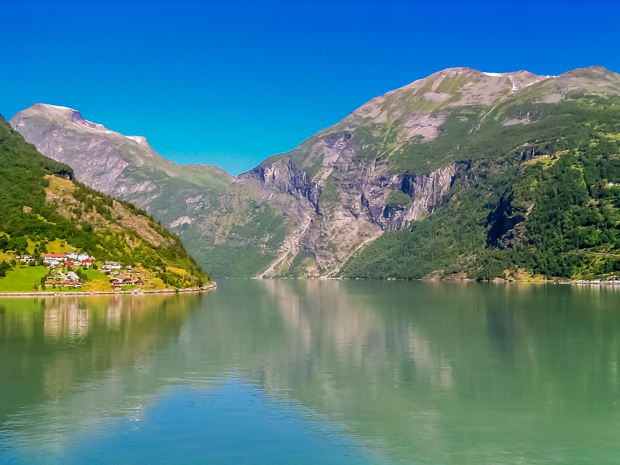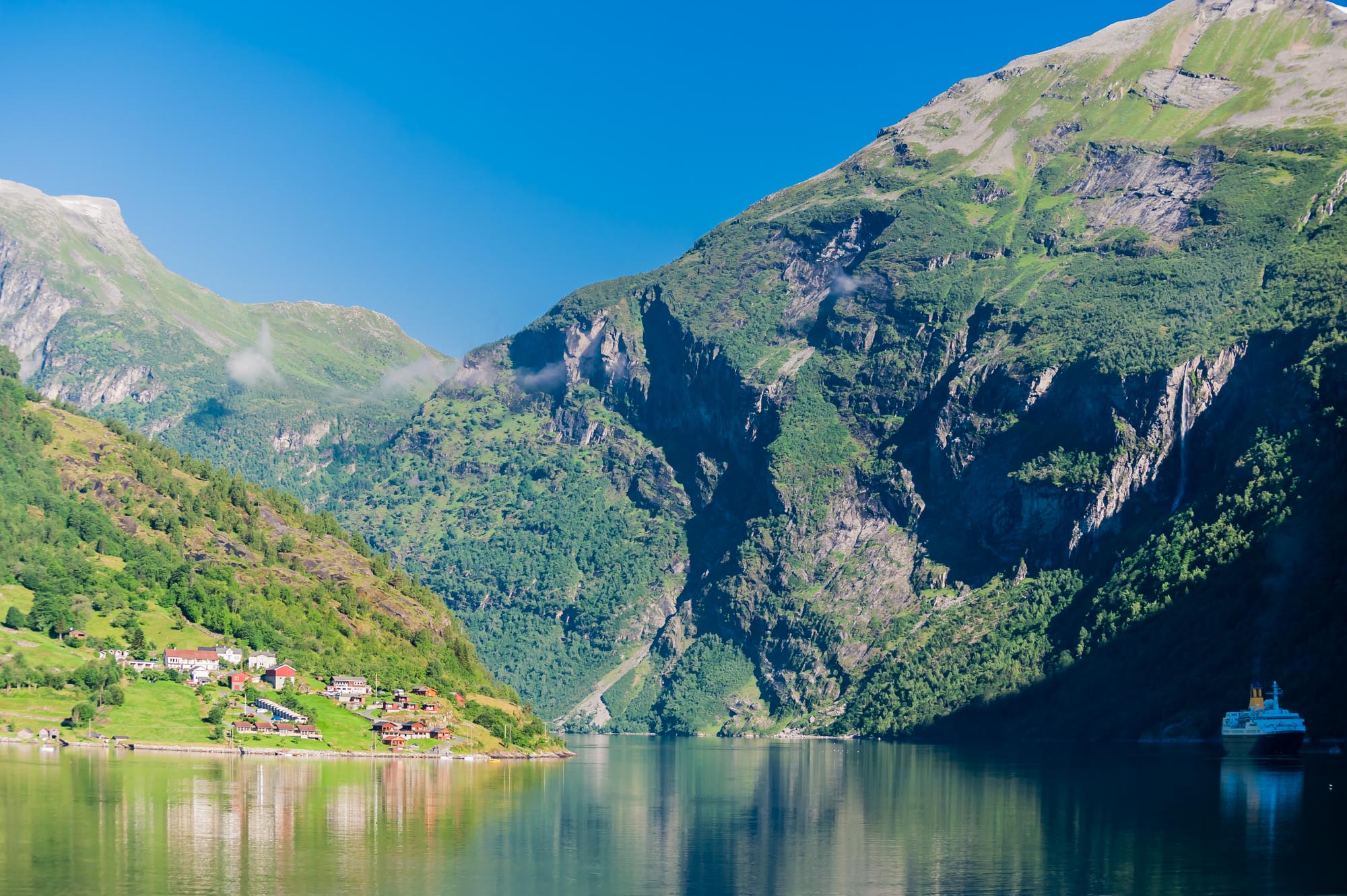 Die Ankunft im Ort Geiranger bildet den Abschluss der Schiffsreise. Der kleine Ort liegt am Ende des Fjords in einer geschützten Bucht. Hier befindet sich ein Hafen, der sowohl von großen Kreuzfahrtschiffen als auch von regionalen Fähren angefahren wird.