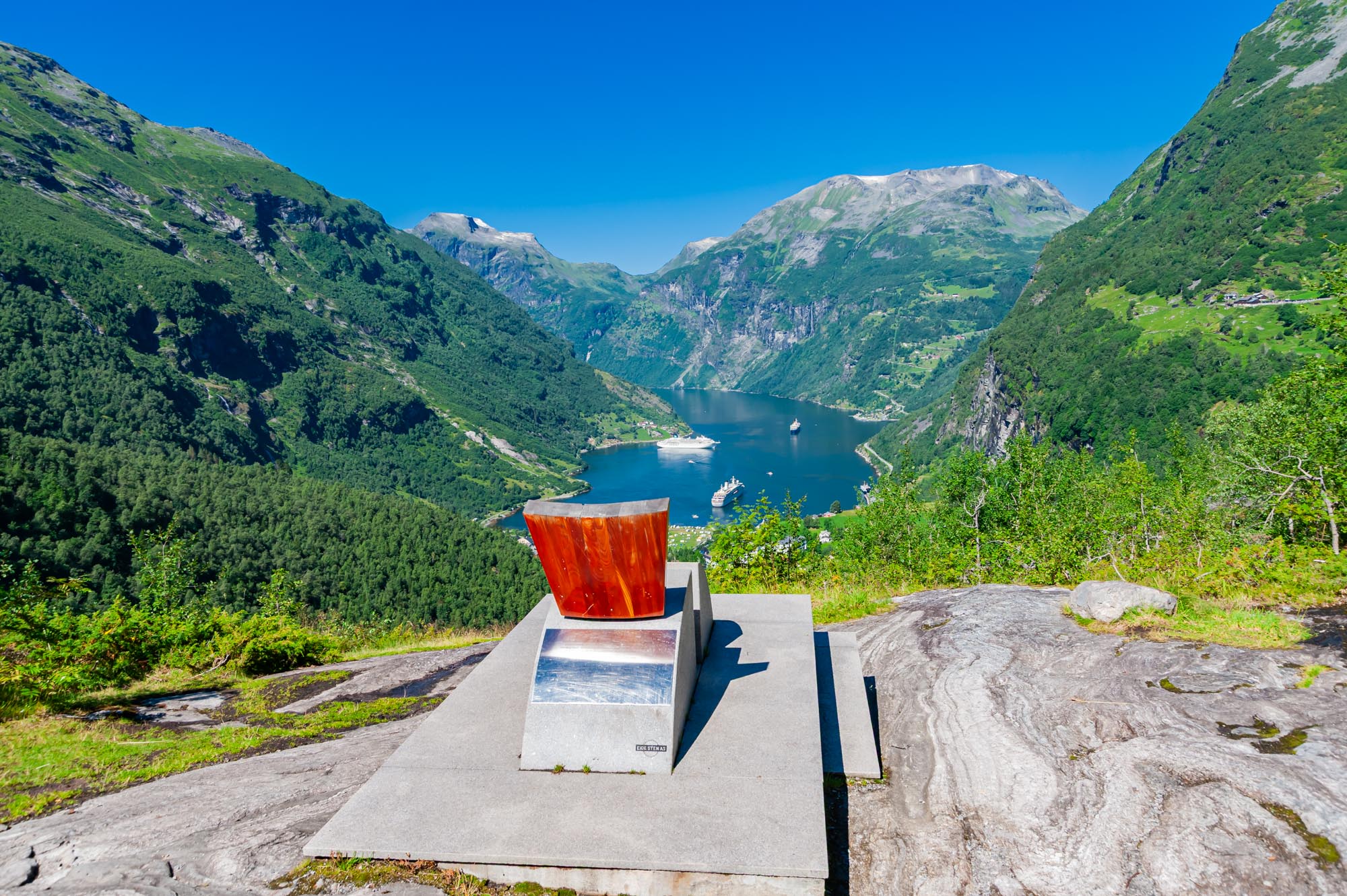 Der Aussichtspunkt ist zweistufig angelegt: eine obere Plattform, die mit dem Auto direkt erreichbar ist, und ein tiefer gelegener Bereich, der durch einen kurzen Fußweg verbunden ist. Von hier eröffnet sich der berühmte Blick, der auf unzähligen Postkarten, Reiseprospekten und Fotografien festgehalten wurde: die gewaltigen Felswände, die schmale Bucht mit Geiranger und die Kreuzfahrtschiffe, die winzig in der Tiefe wirken.