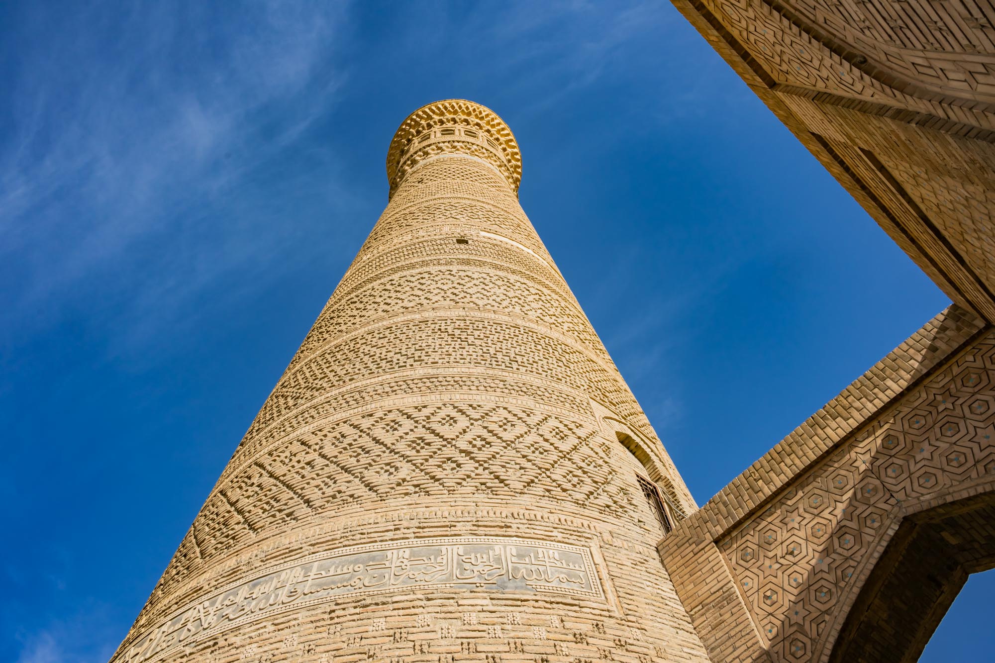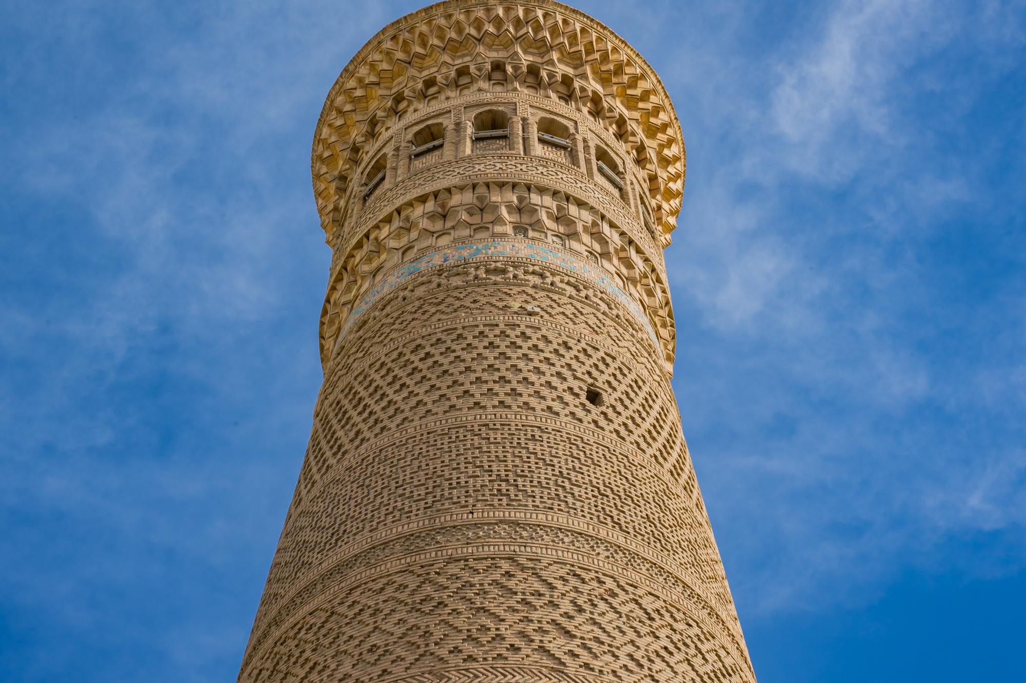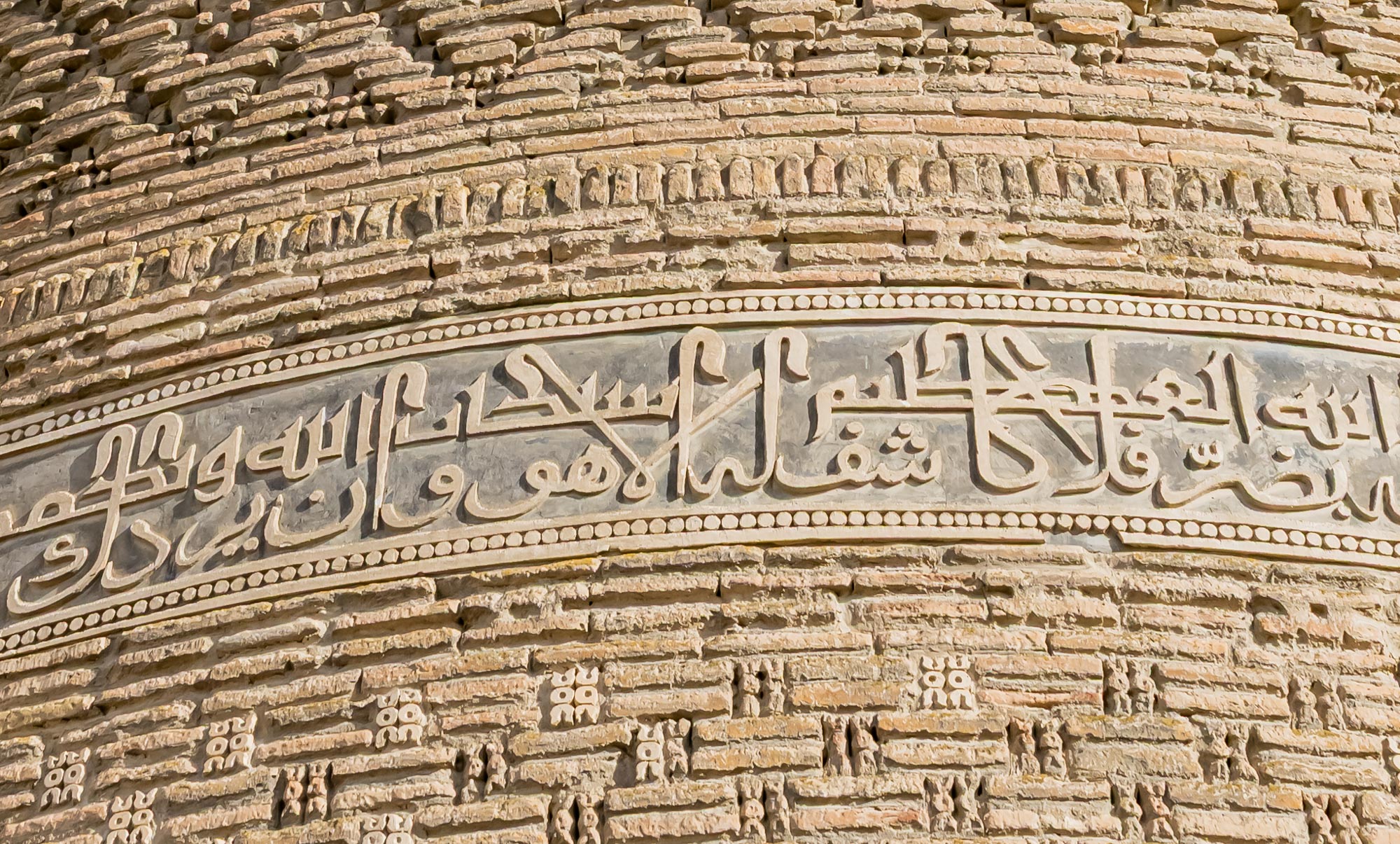 Die ornamentalen Bänder sind ausschließlich durch die Anordnung der Ziegel entstanden – ohne zusätzliche Glasur oder Fayence, wie sie später an der Kalon-Moschee zu finden ist. Diese reine Backsteinarchitektur verleiht dem Minarett eine zeitlose Strenge und zugleich eine subtile Vielfalt.