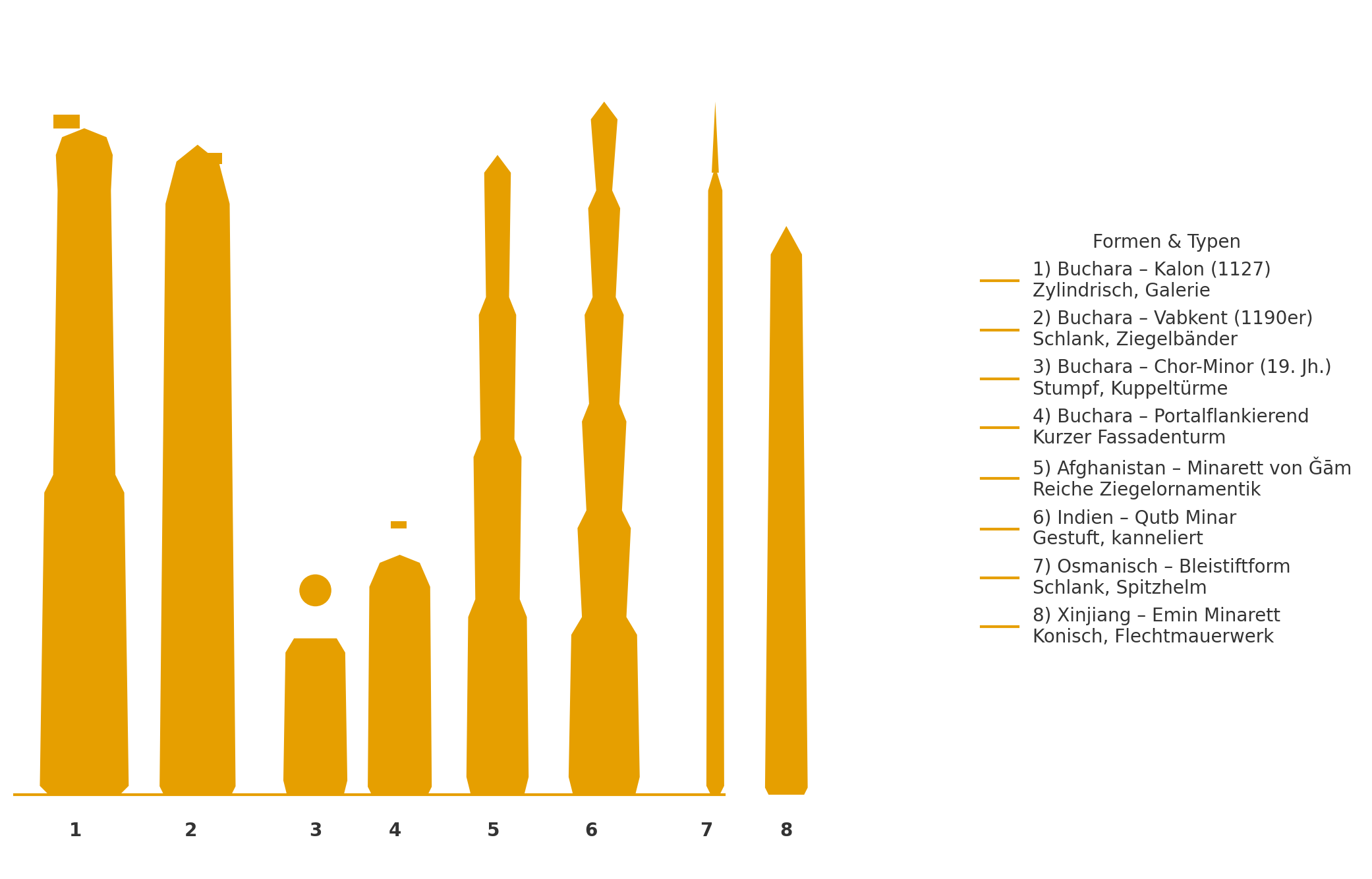 - Ghuridisch/Seldschukisch – Afghanistan/Iran – Minarett von Ǧām – Stark gegliederte, teils kannelierte Schäfte mit reicher Ziegel- und Kachelornamentik. Übergänge zwischen polygonalen und runden Segmenten.