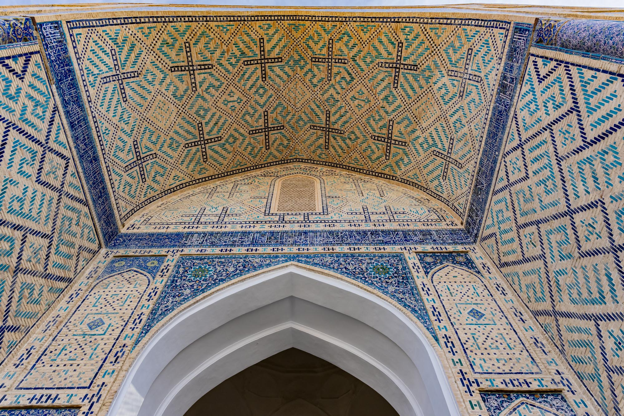 Auch die kleineren Iwane, die in den Hof hineinragen, sind reich mit Fayencen verkleidet. Ihre Oberflächen zeigen geometrische Sterne, Kreuzformen und florale Motive, die in traditioneller zentralasiatischer Manier aneinandergereiht sind. Dadurch entsteht ein harmonisches Zusammenspiel von Architektur und Dekor.