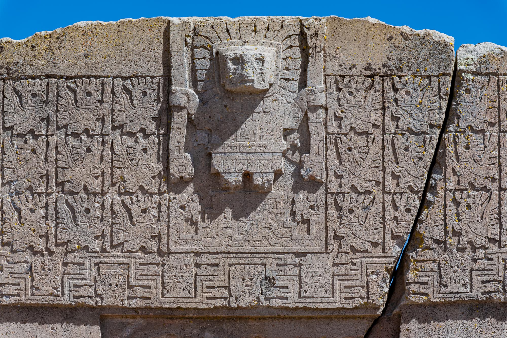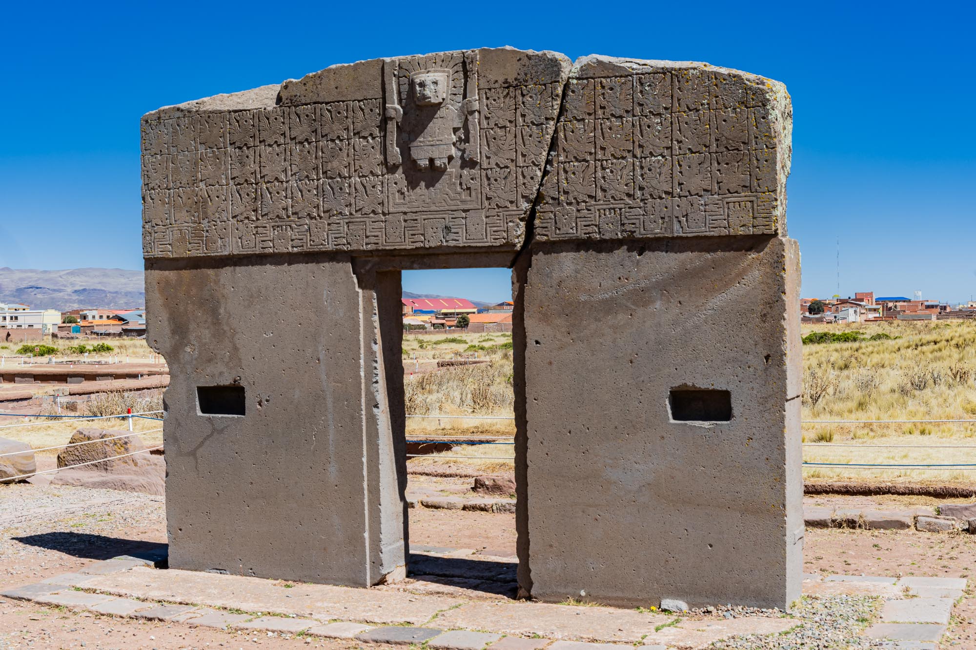 Das bekannteste Monument ist das Sonnentor von Tiwanaku. Es ist aus einem einzigen Andesitblock gefertigt und zeigt aufwendig gearbeitete Reliefs mit einer zentralen Gottfigur, die Strahlen oder Stäbe in den Händen hält. Viele deuten die Bilder als Darstellung eines Kalenders oder von kosmischen Kräften. Wo das Tor ursprünglich stand, ist unklar, doch es war sicher ein heiliger Ort. Heute gilt es als Wahrzeichen von Tiwanaku.
