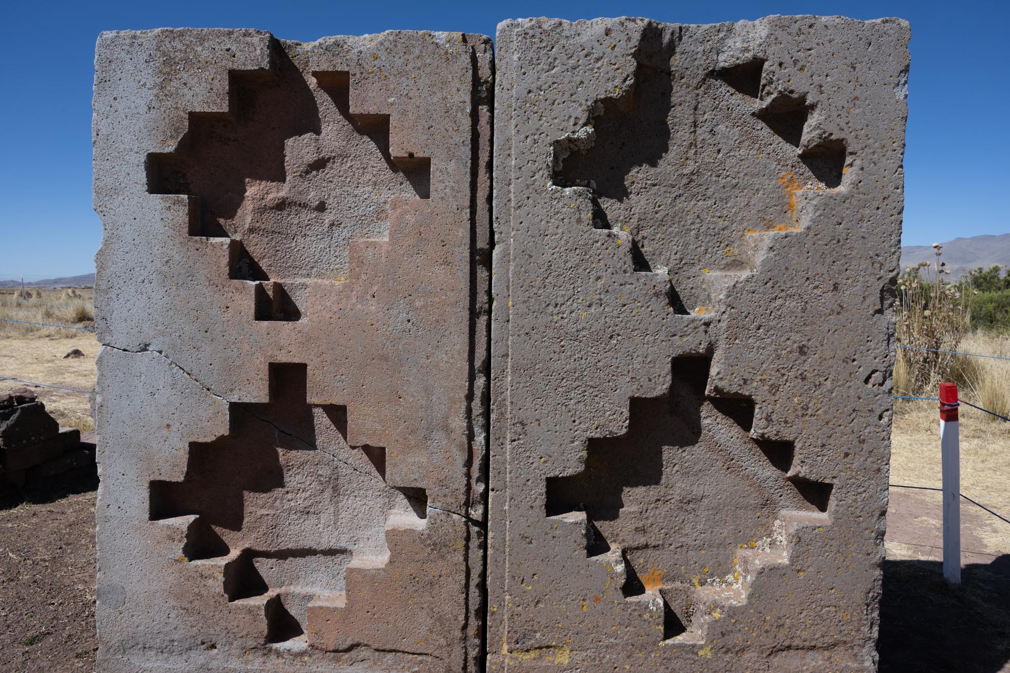 Der dunkle Andesit hingegen ist ein vulkanisches Gestein von hoher Härte. Er wurde für besonders präzise gearbeitete Elemente eingesetzt, etwa für die H-Blöcke im Pumapunku oder für das berühmte Sonnentor. Andesit erlaubte eine feine Bearbeitung und war langlebig, weshalb er für monumentale und symbolträchtige Bauwerke bevorzugt wurde. Seine Herkunft von der Copacabana-Halbinsel deutet zudem auf einen bewussten Bezug zur heiligen Landschaft des Titicacasees hin.