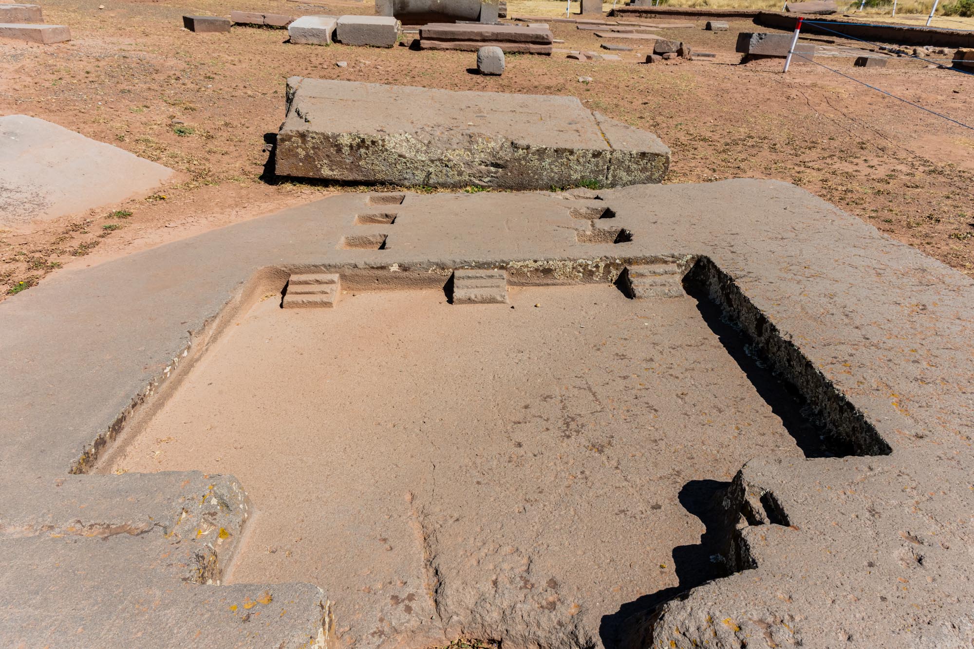 Die noch gewaltigeren Andesitblöcke, die vor allem im Pumapunku-Komplex zu finden sind, wurden aus Steinbrüchen bei der Halbinsel Copacabana am Titicacasee gewonnen – eine Entfernung von etwa 90 Kilometern. Angesichts des enormen Gewichts einiger dieser Blöcke, die mehr als 100 Tonnen erreichen, stellt dies eine herausragende logistische Leistung dar.